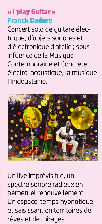 I play « Guitar » : Performance solo de guitare électrique, d’objets sonores, chant, clarinette Turque et sound-design sous influence de la musique Hindoustanie, le rock, la poésie Orientale. Création et interprétation originale par Franck Dadure.